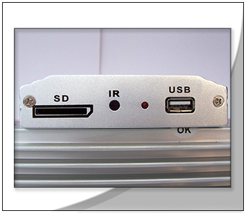 El reproductor Multimedia. Cuenta con una entrada de memoria SD y una de USB. Dicha entrada es la encargada procesar la informacion del contenido tanto sea Video, Musica, Imagenes y Texto. Ademas permite la reproduccion programable del video de seguridad a bordo e institucional de la empresa.