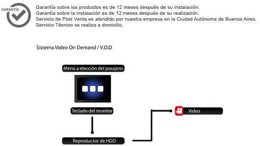 Sistema Video On Demand / V.O.DEl sistema es el ultimo modelo que sale en el mercado. El sistema trabaja con el sistema ANDROID y cuenta las siguientes funciones: VIDEO, MUSICAS, JUEGOS, TEXTO VIRTUAL, COMUNICACION SOCIAL, GPS y muchas mas. El pasajero puede disfrutar la tecnologia de monitores tactiles y tambien las aplicaciones por internet.